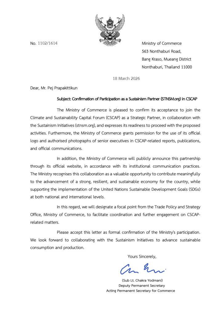 The Ministry of Commerce of the Kingdom of Thailand and Sustainism (STNSM) jointly announce a policy partnership to advance Sustainable Trade as a core component of economic development across the Asia-Pacific region.