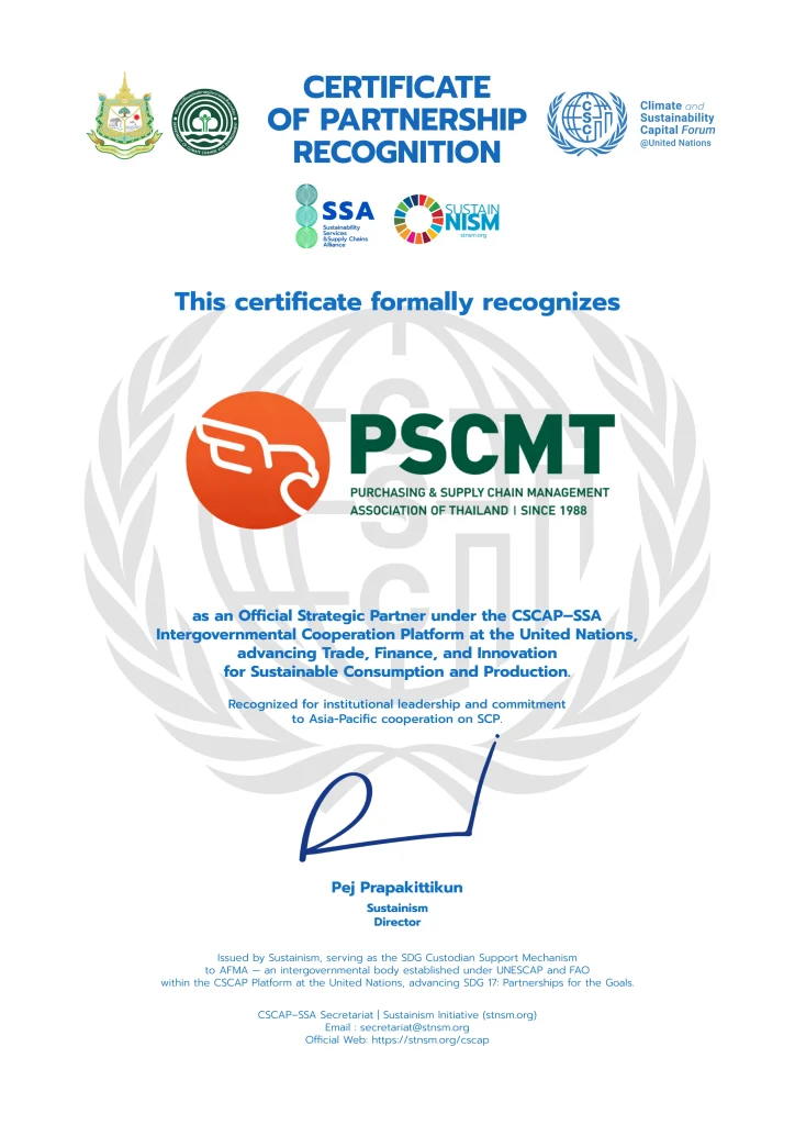 Sustainism Initiatives (STNSM) is pleased to formally announce a strategic partnership with the Purchasing and Supply Chain Management Association of Thailand (PSCMT) to advance Sustainable Consumption and Production (SCP), with a particular focus on Sustainable Procurement as a core driver of SDG 12: Responsible Consumption and Production.