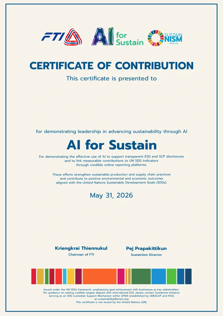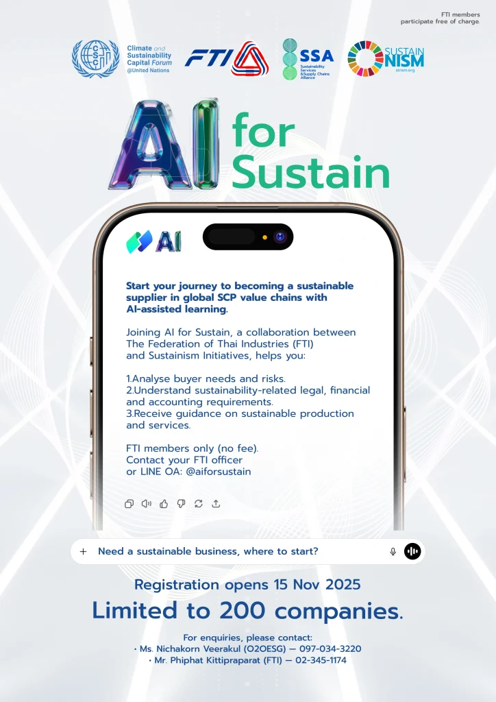 Under the Climate & Sustainability Capital Forum (CSCAP) convened at the United Nations, which advances the global transition toward Sustainable Consumption and Production (SCP), a strategic collaboration has been established between the Federation of Thai Industries (FTI) and Sustainism Initiatives (stnsm.org) to develop the AI for Sustain programme. This initiative is designed to strengthen the capability of Thai enterprises to participate in global sustainable supply chains through the application of artificial intelligence.