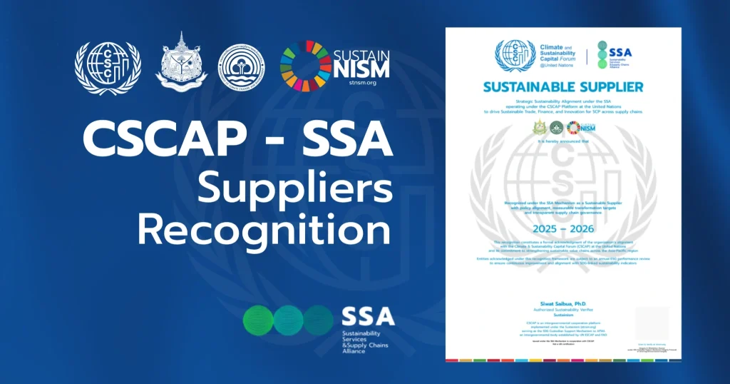 Once an SME has begun implementing ESG practices under the SCP framework and demonstrated measurable progress, the final step is to seek formal recognition as a sustainable supplier on the international stage. This elevates the company’s credibility and visibility among major buyers. A leading mechanism gaining traction in the Asia-Pacific region is the Sustainability Services & Supply Chains Alliance (SSA), established through the collaboration of Sustainism, AFMA, and Thailand’s Ministry of Natural Resources and Environment under the CSCAP platform. Its objective is to create an official, region-wide mechanism for recognizing sustainable supply chains.