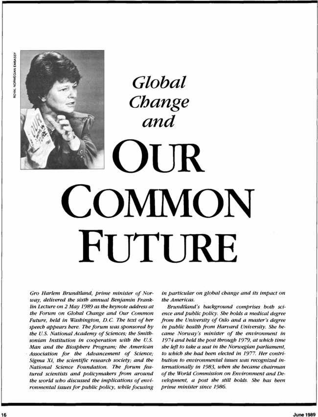 Gro Harlem Brundtland, a Norwegian politician, physician, and former Prime Minister of Norway, played a crucial role in shaping global discussions on sustainable development. As the Chair of the World Commission on Environment and Development (WCED), she led efforts to define and promote sustainable development through the landmark 1987 report, Our Common Future. This report laid the foundation for modern sustainability policies and emphasized the need for an integrated approach to economic growth, environmental conservation, and social development. This research examines the significance of Brundtland’s work and the impact of Our Common Future on global sustainability efforts.