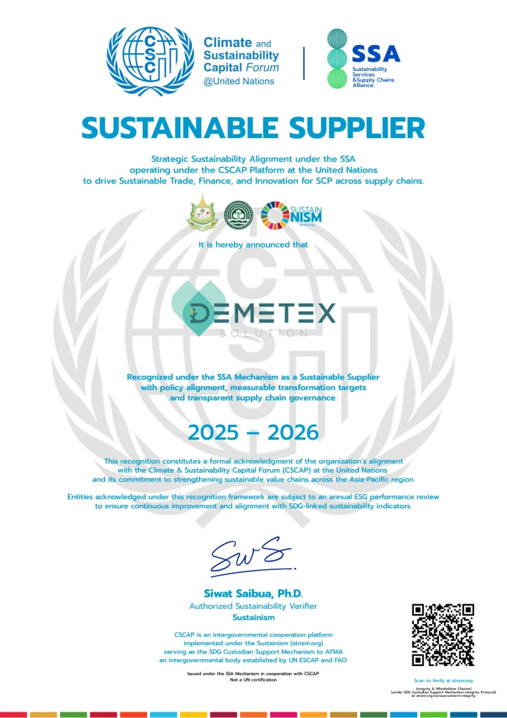 DEMETEX Solution Co., Ltd. has been recognized in the 2025–2026 cycle of the CSCAP–SSA (Sustainability Services & Supply Chains Alliance) as a Sustainable Supplier. This regional UN-associated platform—coordinated via the Sustainism Initiative in partnership with AFMA (an intergovernmental body established by UN ESCAP and FAO) and UN ESCAP—aims to build inclusive, resilient, and sustainability-aligned procurement ecosystems across Asia and the Pacific.